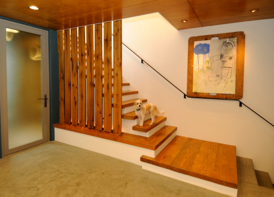 A vertical staircase screen of reclaimed wood filters natural illumination from a skylight into the interiors.