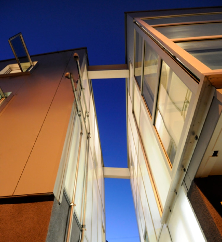 The defining element – a cleft or light box-like void in the center of the structure – provides visual and aural separation between the two units.