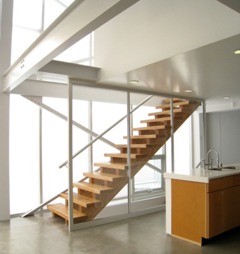 The dramatic engineered wood staircase evokes sculptural simplicity. High efficiency, green and energy efficient systems are integrated throughout.