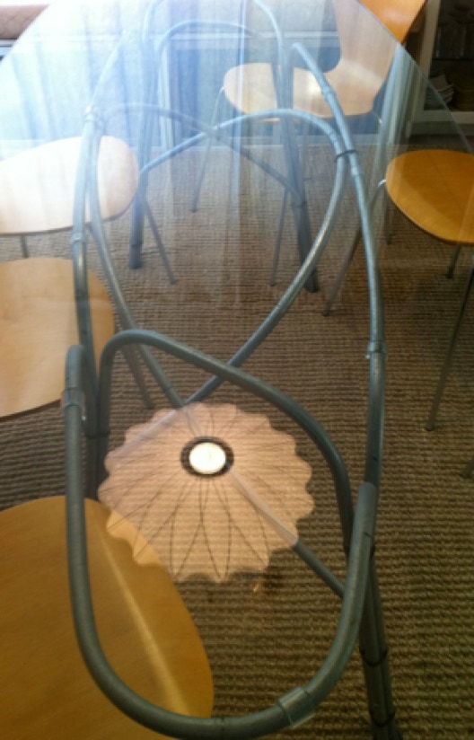 The hand-bent galvanized tubing is intended to play off the bent frame of the Jacobsen Ant chairs and Nelson Propellor lamp. The frame is only held together by tie-wire at strategic locations.