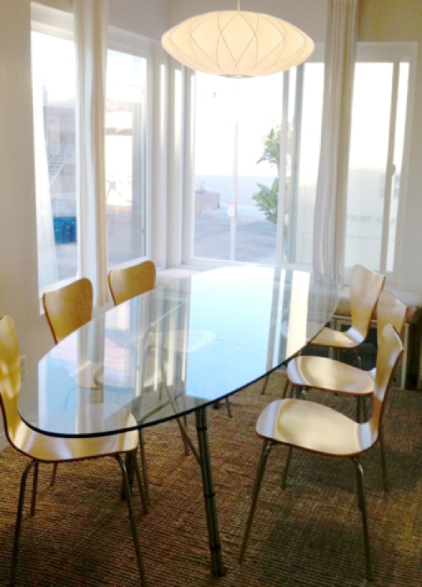 This custom table was designed to have a shape reminiscent of a surfboard and fit in a narrow dining room at the beach.
