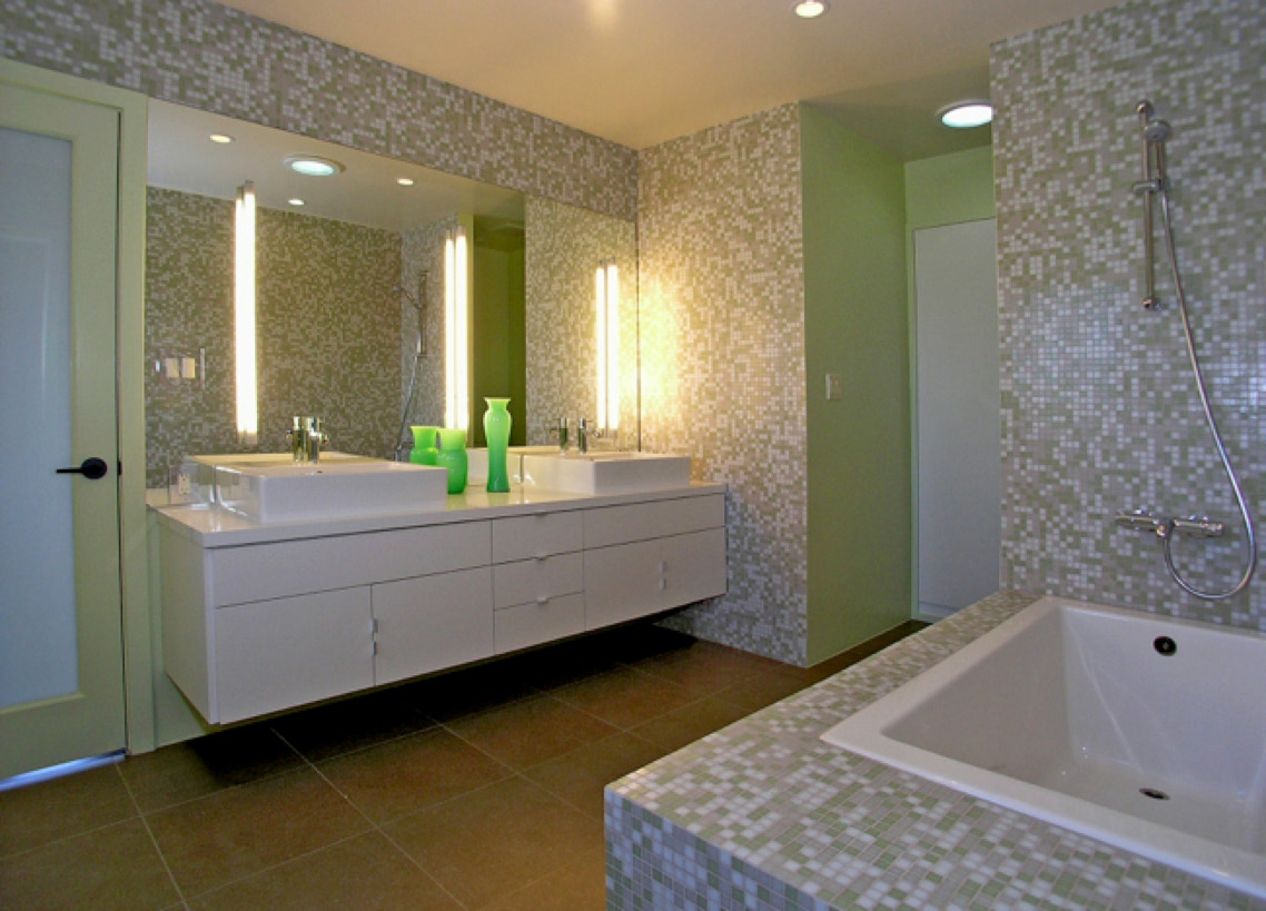 Bathroom interiors blend sleek, water-efficient fixtures with colorful recycled glass mosaic tile. Energy efficient, mirror-mounted Italian light fixtures, coupled with natural sky tube lighting significantly reduce artificial lighting.