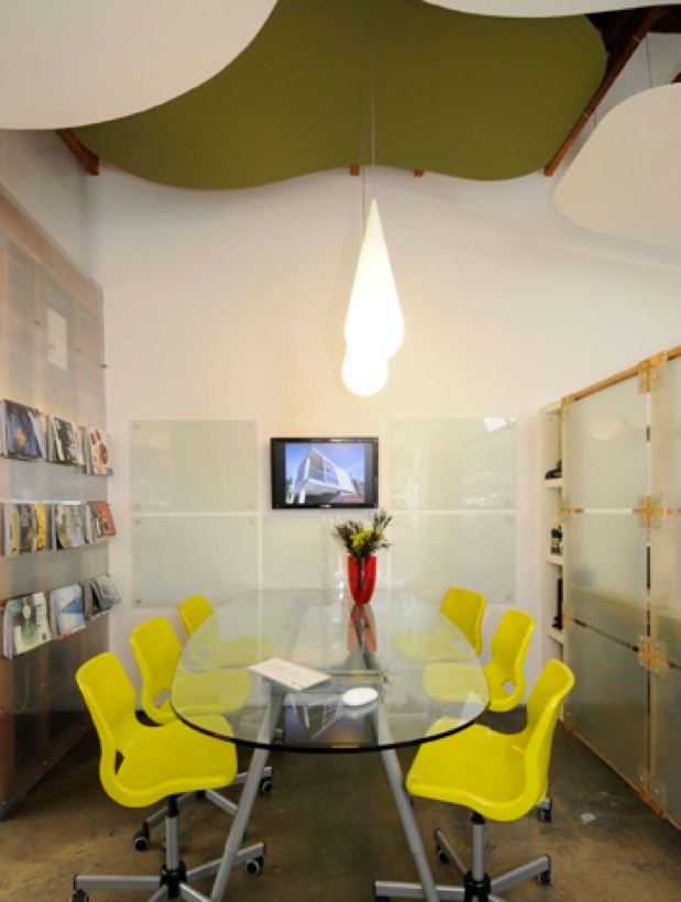 Energy-efficient sculptural Rotaliana pendants hover above meeting and display areas.